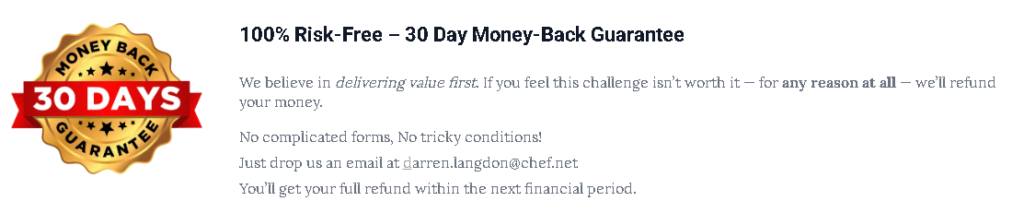 If you are not happy for any reason, just email Darren Langdon at darren.langdon@chef.net. They promise a full refund. No hard forms or tricky rules. Your money will be sent back in the next money period.